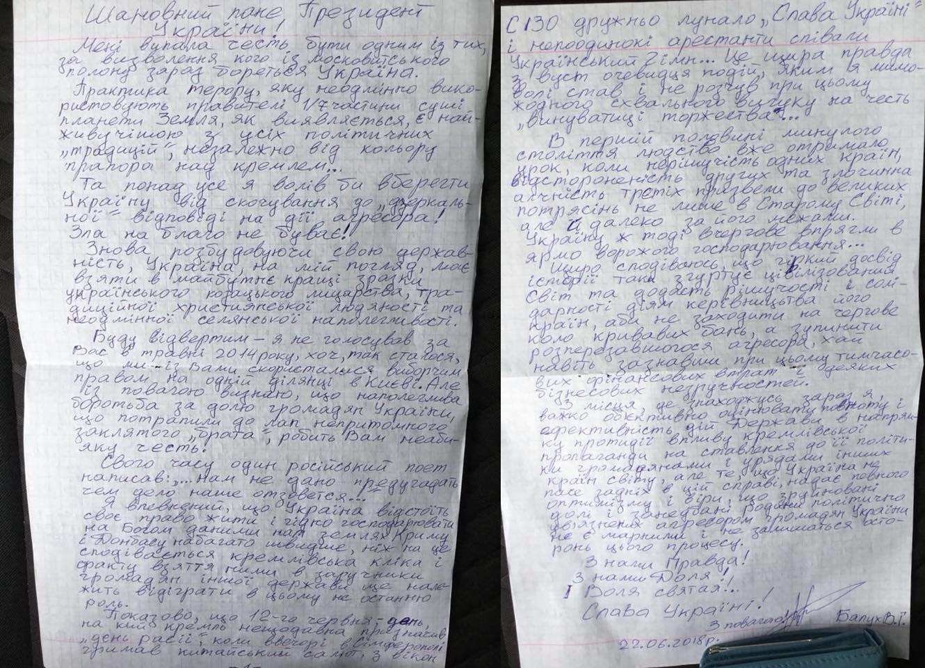 В своём обращении Балух поведал Порошенко, что 12 июня (в День России) в симферопольском СИЗО бандиты и прочие антисоциальные элементы «пели гимн Украины и кричали “Слава Украине!”».