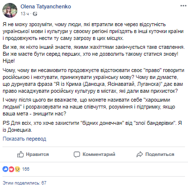 Его комментарий появился под украиноязычным постом переселенки с Донбасса Елены Татьянченко, которая возмутилась тем, что люди, уехавшие на Украину с Донбасса и Крыма, говорят на русском языке.