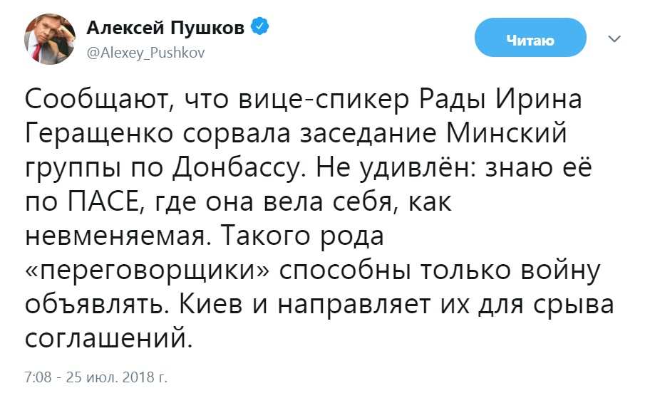 Такого рода „переговорщики“ способны только войну объявлять», — вспомнил свои впечатления от личного общения с Геращенко Пушков.