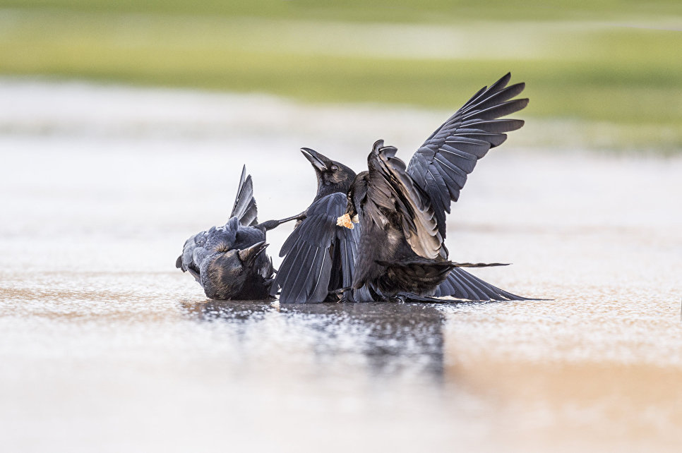 Чаще всего стычки происходили в период активного гнездования — с марта по май. Обыкновенные вороны — известные клептопаразиты. Они наживаются на чужих гнездах, в особенности на гнездах американских и северо-западных воронов.