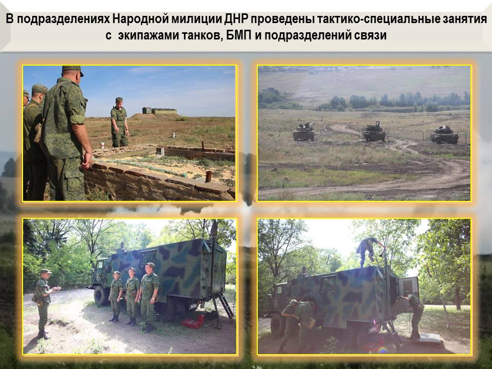 На этой неделе в подразделениях Народной милиции Донецкой Народной Республики прошли тренировки танковых экипажей по применению средств РХБ защиты, тактико-специальные занятия с экипажами танков, БМП и подразделений связи. Привлечено более 1 500 человек личного состава подразделений Народной милиции.