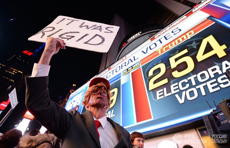 Горожанин в образе кандидата в президенты США от Республиканской партии Дональда Трампа на площади Таймс-сквер в Нью-Йорке. 8 ноября 2016 года