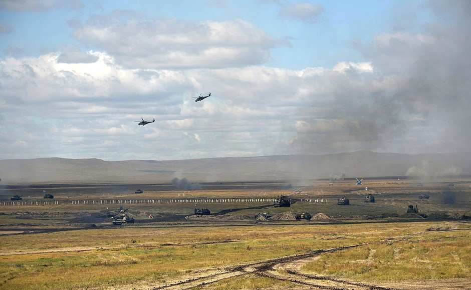 Вместе с президентом России на смотровой вышке центрального командного пункта полигона находились министр обороны Сергей Шойгу, начальник Генштаба Вооружённых Сил Валерий Герасимов, министр обороны Китая Вэй Фэнхэ и замначальника объединенного штаба Народно-освободительной армии Китая (НОАК) Шао Юаньминь, а также командир бригады ВС Монголии Гансэлэм Лхагвасурэн.