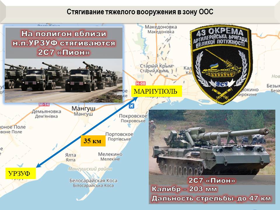 Так, под прикрытием проведения с 17 по 22 сентября на полигоне вблизи н.п. Урзуф соревнования на лучшую артиллерийскую батарею к Мариуполю стягиваются 203-мм артиллерийские установки 2С7 «Пион» из состава 4-го САДН 43-й ОАБр.
