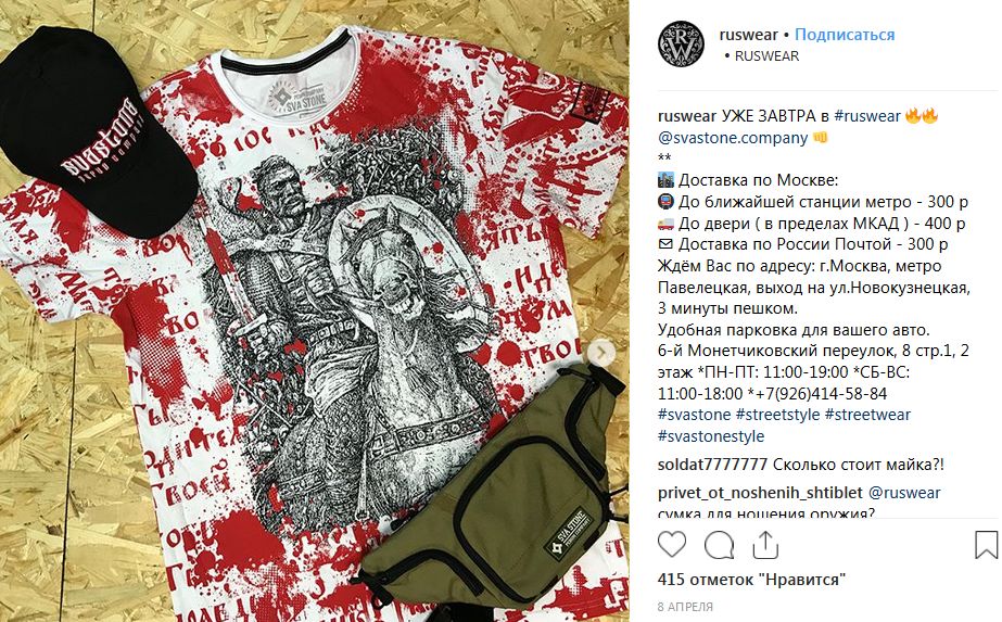 При этом «Русич» — не только онлайн-магазин, но ещё и офлайновая торговая точка, ранее находившаяся в бизнес-центре «На Электродной», а в январе этого года переехавшая в 6-й Монетчиковский переулок (недалеко от станций метро «Павелецкая» и «Новокузнецкая»). Эти адреса открыто указывались на страницах магазина в соцсетях (47,8 тыс. подписчиков во «ВКонтакте» и 12,7 тыс. — в «Инстаграме», есть также страницы во всех прочих известных соцсетях).