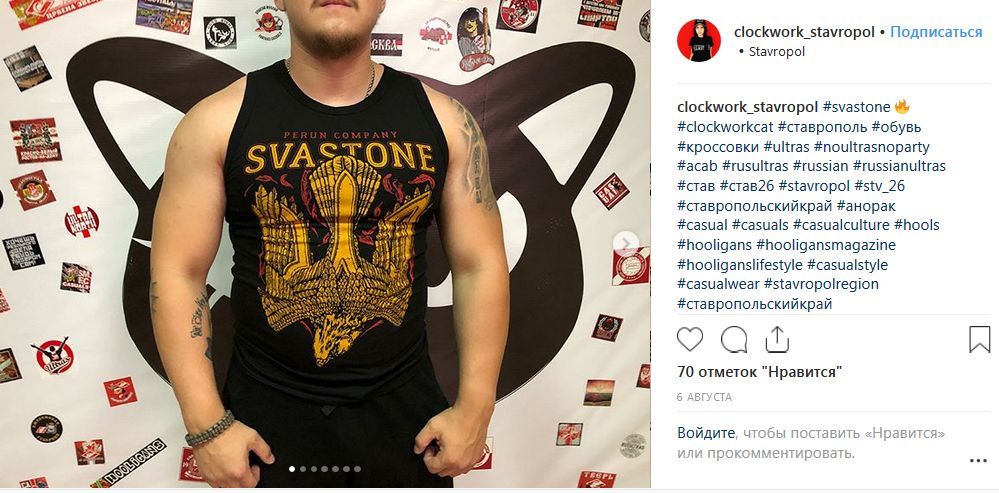 Можно найти изделия «свастического» бренда и в Ставрополе, в магазине Clockwork Cat, судя по названию, ориентированного на правых болельщиков местного футбольного клуба «Динамо» (у последних, кстати, ещё с нулевых годов были налажены прямые связи с «Сокирой Перуна»).
