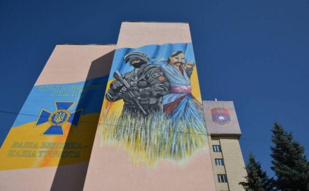 Здание Национальной академии СБУ украсили «патриотическим» муралом, на котором изображены украинский казак и современный воин, готовые, как сказано в описании изображения, «в любую минуту отразить нападение противника».