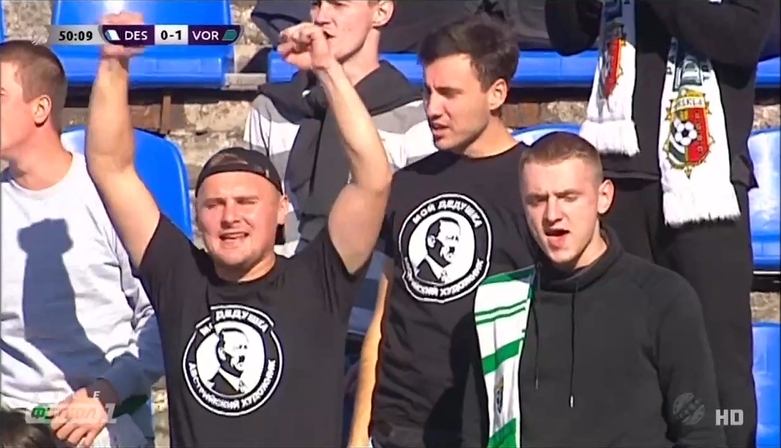 На ультрас были надеты черные футболки с большим портретом Гитлера на груди. Вокруг изображения была сделана надпись на русском языке «Мой дедушка австрийский художник».