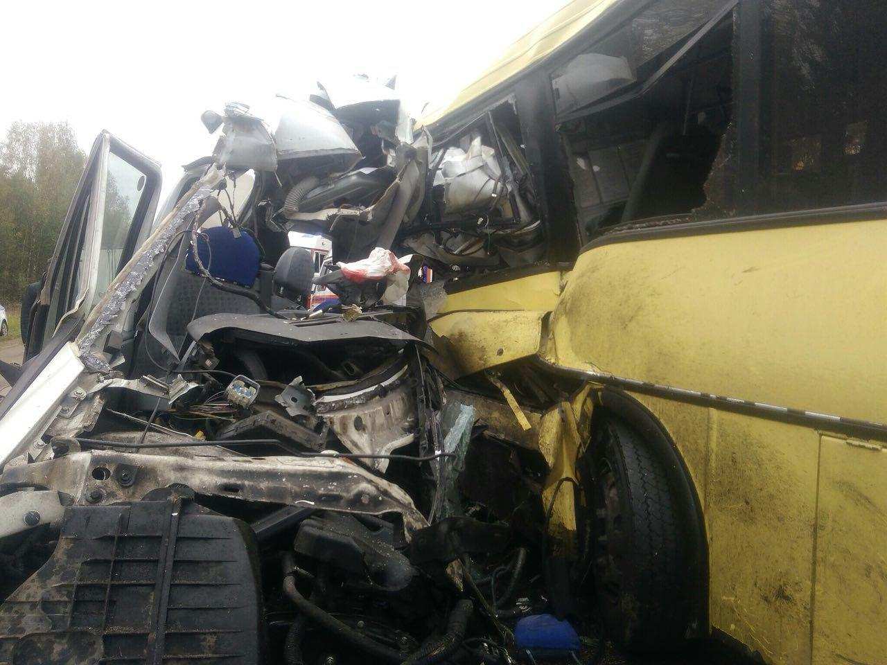 В районе населённого пункта Некрасово микроавтобус Ford Transit выехал на встречную полосу и лоб в лоб столкнулся с рейсовым автобусом ЛиАЗ.