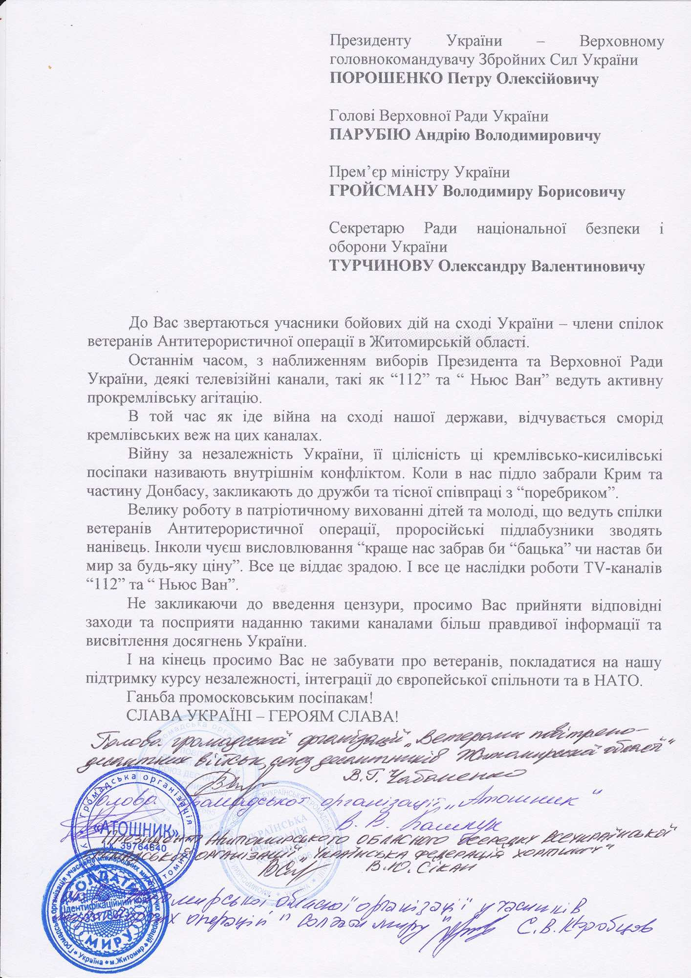 Из письма следует, что Порошенко поставил задачу (судя по всему, всем силовым структурам) «мочить» два телеканала — «112» и «News One», которые перед выборами президента Украины ему как кость в горле: открывают людям глаза на происходящее вокруг.
