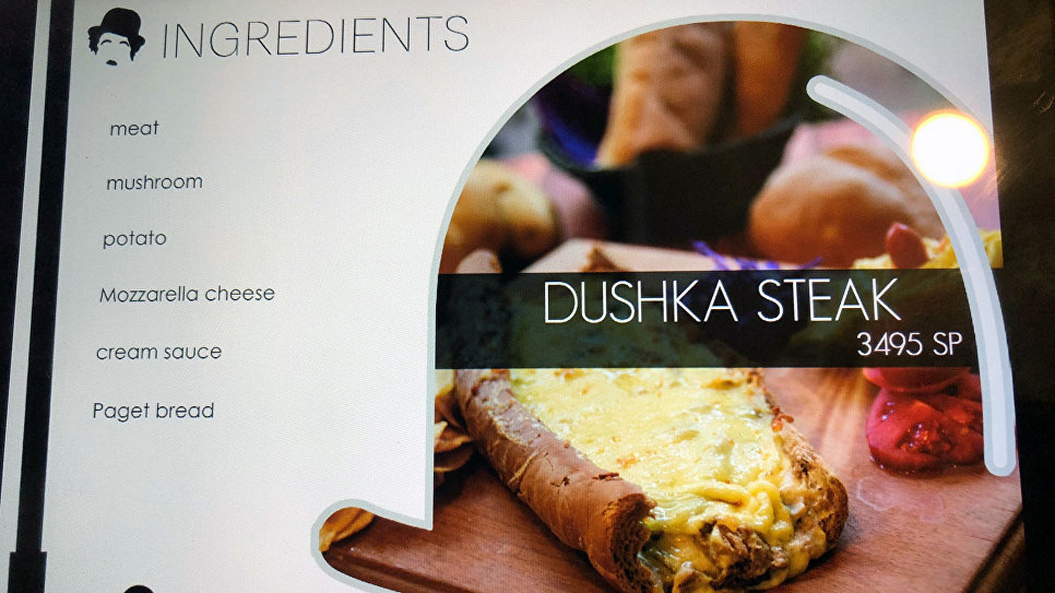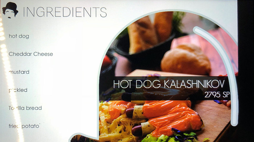 Российскому оружию посвящена и не вполне русская куриная тортилья «ПКС» в честь пулемета Калашникова. Наконец, внимание гурманов может привлечь мясной стейк «Душка» — как рассказал шеф-повар, имеется в виду пулемет ДШК, а также хрустящая куриная закуска «РПГ».