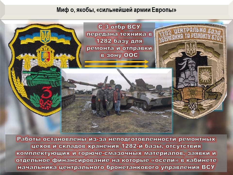 В связи с этим, по распоряжению начальника генерального штаба ВСУ, на 1282-й центральной базе хранения и ремонта бронетанкового вооружения и техники в н. п. Ярмолинцы Хмельницкой области в экстренном порядке проводится техническое обслуживание и ремонт более 80 танков Т-72 и 12 САУ 2С3 «Акация» из состава 3-й отдельной танковой бригады для обеспечения соединений, выполняющих боевые задачи в зоне «ООС».