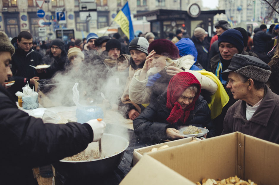 Жители Печерского района Киева выстраиваются в длинные очереди за бесплатной едой.