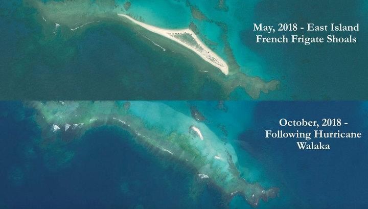 Ученые изучили спутниковые снимки Гавайских островов до и после мощного урагана «Валака», прошедшего над Тихим океаном, и заметили, что один из остров по состоянию на октябрь 2018 года остаётся полностью скрытым под водой.
