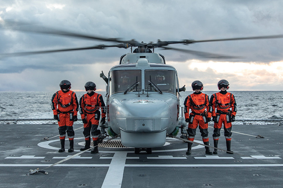 Португальские военнослужащие на палубе норвежского фрегата HNoMS Helge Ingstad во время совместных учений войск НАТО Trident Juncture 2018 («Единый трезубец») в Норвежском море. 26 октября 2018