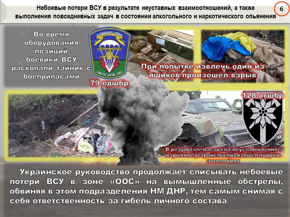 Как мы неоднократно заявляли, украинское руководство продолжает списывать небоевые потери ВСУ в зоне «ООС» на вымышленные обстрелы, обвиняя в этом подразделения Донецкой Народной Республики. Тем самым командование оккупантов пытается снять с себя ответственность за гибель личного состава.