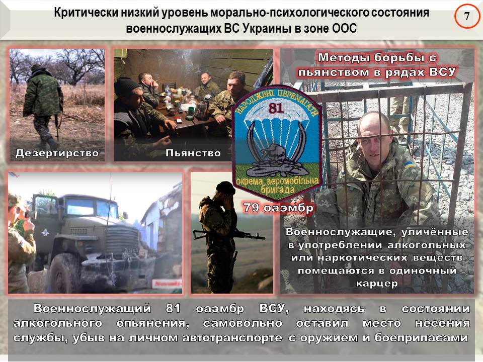 Так, 3 ноября 2018 года один из боевиков 122-го батальона 81-й аэромобильной бригады ВСУ младший сержант Домбровский, находясь в состоянии алкогольного опьянения, самовольно оставил место несения службы вблизи населённого пункта Новосёловка Волновахского района и убыл на личном автотранспорте в неизвестном направлении, прихватив с собой свое оружие с боеприпасами.