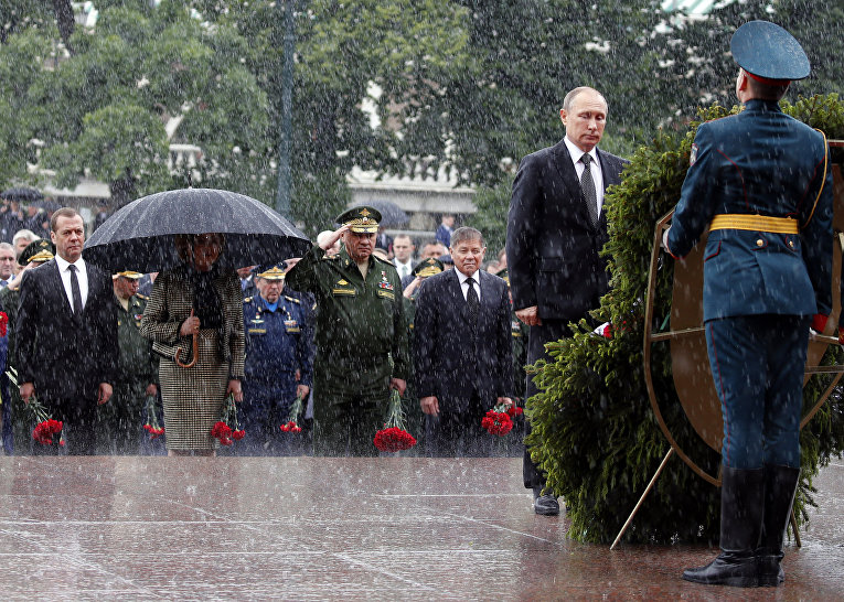 На заглавной фотографии президент России возлагает цветы к могиле Неизвестного солдата 22 июня 2017 года под проливным дождём.