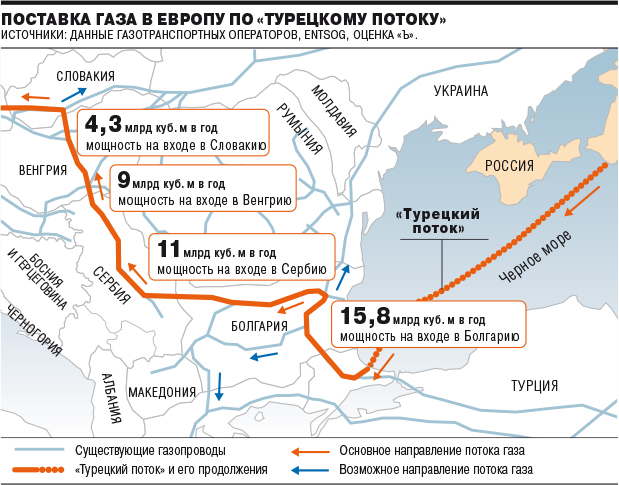 Как отмечает издание, на то, что газопровод пройдет через Болгарию, Сербию, Венгрию и Словакию, указывают материалы газотранспортных операторов этих стран в рамках процедуры бронирования их будущих мощностей (open season). Данная процедура предусмотрена законодательством для строительства газопроводов.