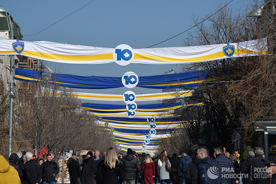 Участники праздничных мероприятий, посвященных 10-летию независимости Косово в Приштине. 16 февраля 2018