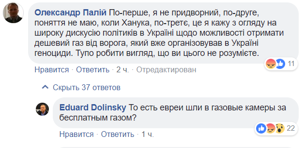 «Придворный политический эксперт Олександр Палий в канун Хануки издевается над Холокостом: “Бесплатный газ бывает только в газовых камерах”», — пишет в Facebook глава украинского Еврейского конгресса Эдуард Долинский.