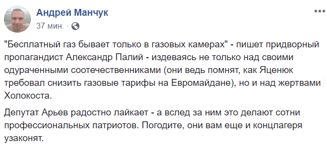 «”Бесплатный газ бывает только в газовых камерах”, — пишет придворный пропагандист Александр Палий, издеваясь не только над своими одураченными соотечественниками (они ведь помнят, как Яценюк требовал снизить газовые тарифы на Евромайдане), но и над жертвами Холокоста.