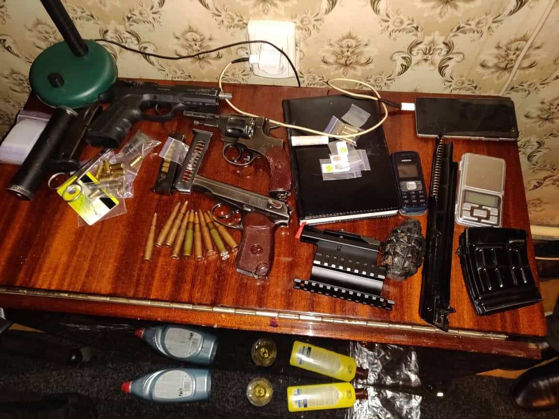 По месту жительства бывшего оперуполномоченного проведен санкционированный обыск и обнаружено снайперская винтовка «СВД» с оптическим прицелом и снаряженным магазином, пистолет Макарова, револьвер, пистолет с глушителем, корпус ручной осколочной гранаты Ф-1, более 250 патронов различного калибра, 6 пакетов метамфетамина, 1 пакет каннабиса и денежные средства.