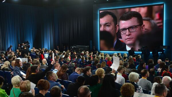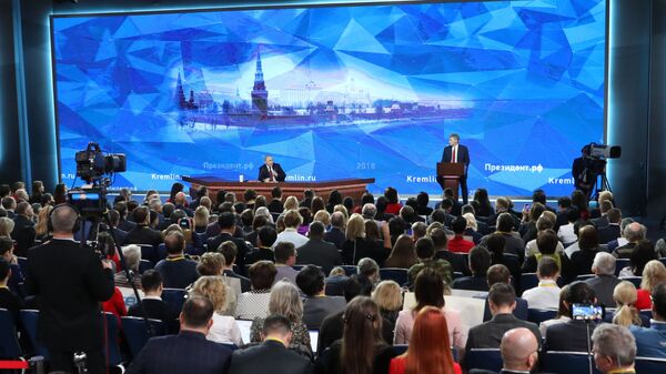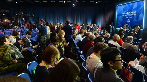 Путин по традиции отвечает на острые актуальные вопросы российских и зарубежных журналистов. В этом году на пресс-конференцию аккредитовались более 1700 корреспондентов.