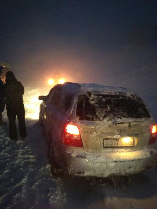 Говорили о лавинах — это не лавины, это снежные перемёты. Т. е. минут за 10–15 ветер наметает в каком-то месте дороги снежный сугроб высотой сантиметров 50, размерами в ширину дороги и длиной метров 5–8. Всё, проехать невозможно. Один умник сунулся было уже просто наверху переехать, нагрёб под пузо снега и повис [рукалицо]. Сталкивали.