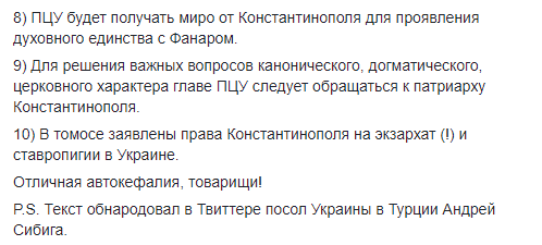Он иронично поздравил сторонников автокефалии, которые якобы получили, что хотели, и отметил, что новая церковь не будет иметь право создавать зарубежные епархии и приходы.