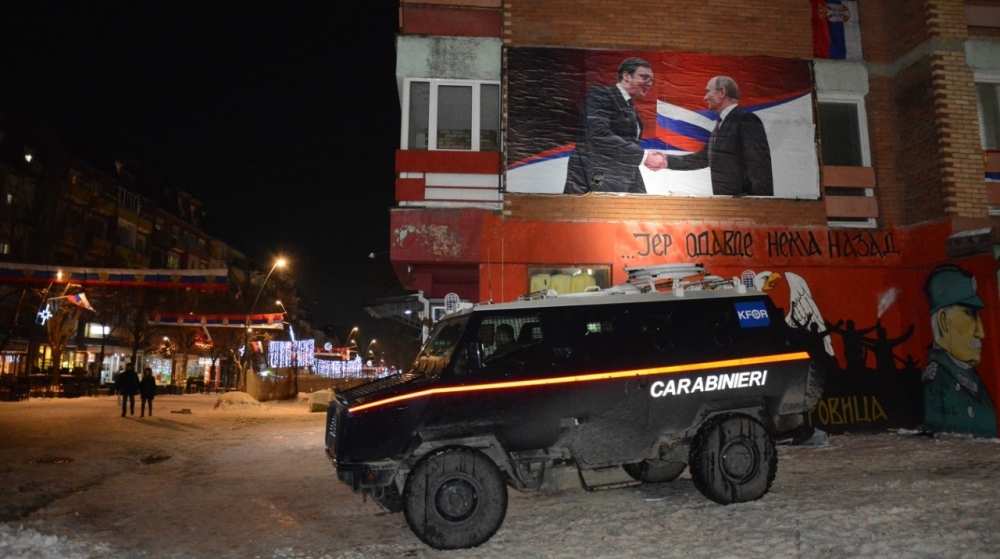 Центральная площадь и главная улица в северной части Косовской Митровицы украшены большим количеством сербских и русских флагов, а флаг Российской Федерации также виден в непосредственной близости от моста через Ибар, который соединяет северную (сербскую) и южную (албанскую) части города.