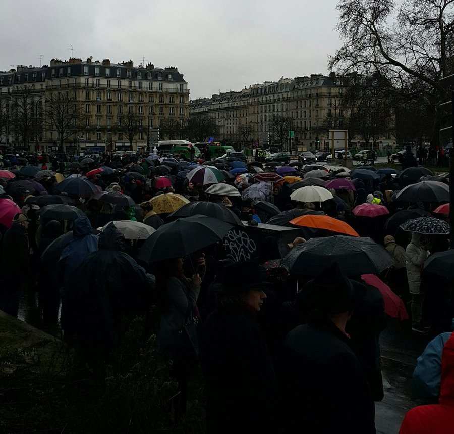 «Нет — насилию», «Уважение — нашим институтам», скандируют пришедшие на марш. Периодически они поют «Марсельезу», у многих присутствуют красные элементы в одежде — шарфы, платки, шапки, береты, рюкзаки, куртки, зонты.