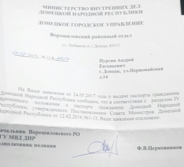 — Нужно учитывать факт, что с 2015 года я нахожусь под украинскими и международными санкциями, из-за которых я не могу выехать за границу. На Украине я вообще нахожусь в розыске. Кроме того, мне ограничен доступ в Google и Facebook. Но я считаю, что отказ в предоставлении паспорта связан с личной неприязнью тех офицеров СБУ, которые сегодня работают в МГБ ДНР. Других причин я не вижу.