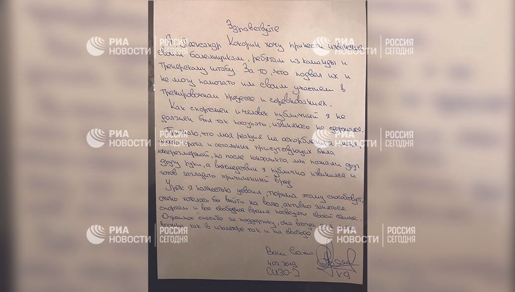 В распоряжение РИА Новости поступило письмо нападающего «Зенита» Александра Кокорина, в котором футболист принес извинения болельщикам, одноклубникам и тренерскому штабу.