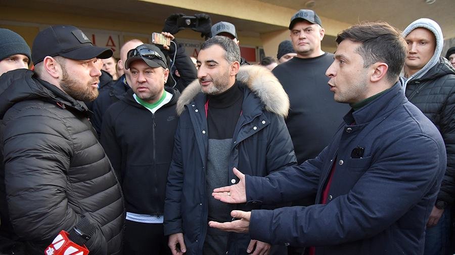 Протестующие встретили артиста нелестными выкриками и плакатами «Клоун, проплаченный олигархами», намекая на тесную дружбу комика с беглым Игорем Коломойским. Зеленского и его артистов взяли в плотное кольцо, мешая им войти в здание.