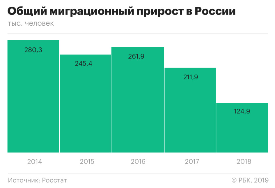 Количество прибывших в Россию в 2018 году уменьшилось на 4%, до 565,7 тыс. человек, количество выбывших увеличилось на 17%, до 440,8 тыс. человек.