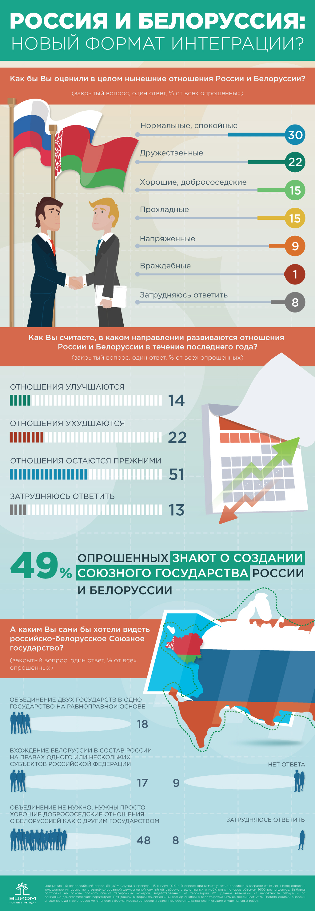 Уточняется, что 51% россиян впервые услышали в ходе опроса о договоренности России и Белоруссии создать Союзное государство. По данным экспертов, население обеих стран пока не готово к объединению.
