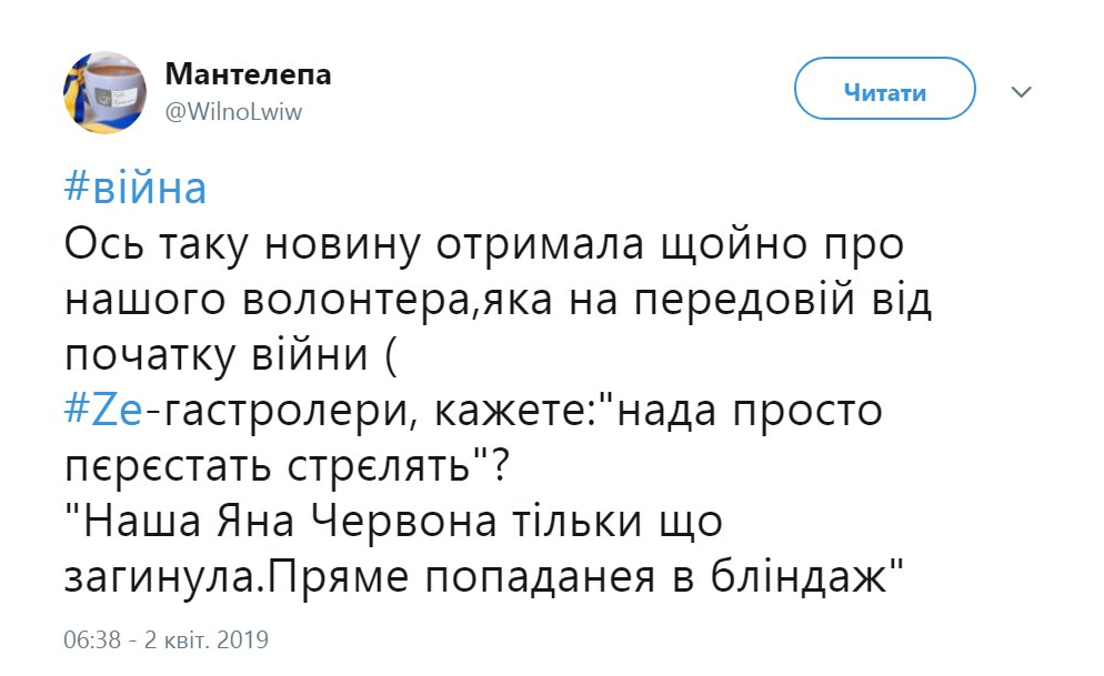 Яна Червоная находилась в зоне проведения карательной операции на Донбассе с сентября 2016 года. Также она являлась известной «порохоботкой» и участвовала во множестве сетевых флешмобов в поддержку Петра Порошенко (фото ниже).