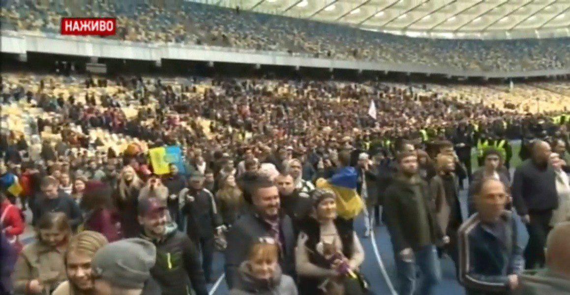 Итак, украинское телевидение начинает прямую трансляцию так называемых дебатов с киевского стадиона «Олимпийский».