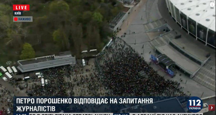 «Если Зеленский не придёт сегодня, мы будем его приглашать каждый день! Сейчас я пойду общаться с журналистами — так, чтобы можно было задать любой вопрос», — заявил со сцены Порошенко.