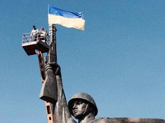 Знамение: В Харькове молния срезала украинский флаг на монументе Воину-освободителю (ФОТО)
