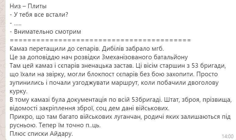 Как следует из опубликованного ею скрина переписки, заехавшие на блокпост Народной милиции ДНР украинские оккупанты являются старшинами ВСУ, а в перевозившем их грузовике находилась секретная документация и списки боевиков «Айдара».