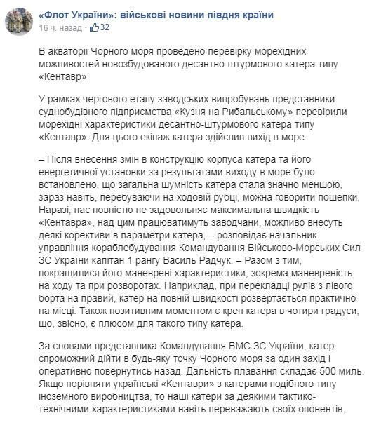 Заводские испытания выявили несоответствие максимальной скорости заявленным техническим характеристикам у десантно-штурмовых катеров типа «Кентавр» ВМС Украины.