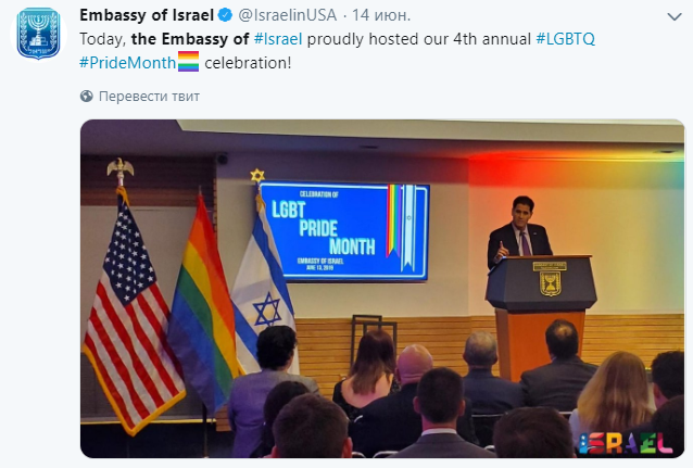 В то же время работники филиала посольства США в Тель-Авиве разукрасили в радужные цвета само здание в честь прайда, который прошел в стране 14 июня.