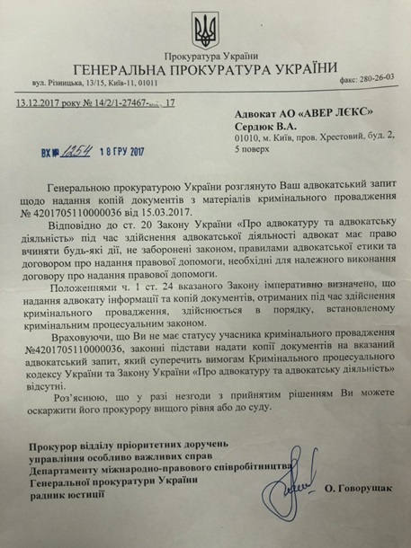 Соответствующий ответ ГПУ был опубликован адвокатом 10 июня.