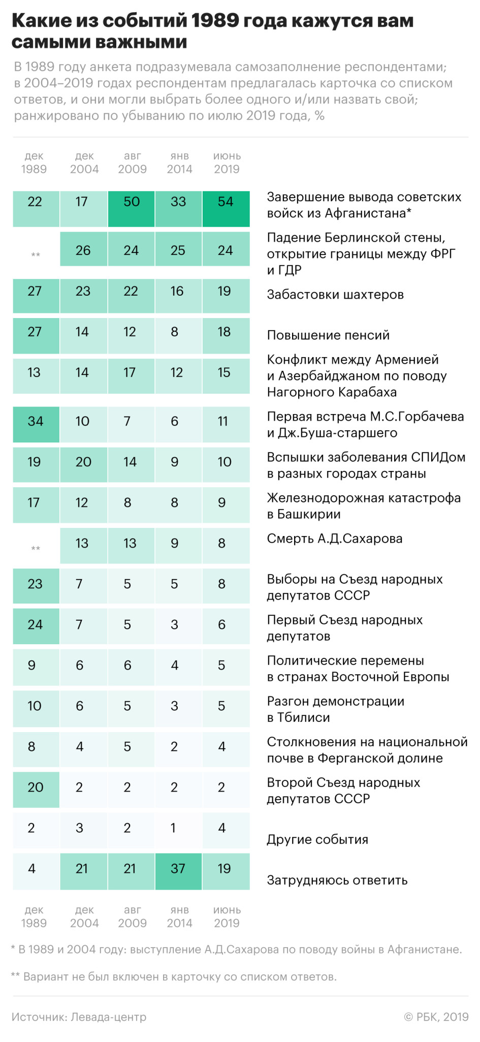 Аналитики из Левада-центра спросили россиян, какое событие 1989 года они считают наиболее важным. Более половины респондентов (54%) назвали таковым вывод советских войск из Афганистана.
