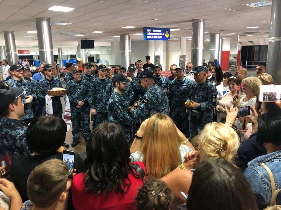 «Сегодня в аэропорту Борисполь украинских военных моряков из плена встречали традиционным украинским караваем с солью и наградами.