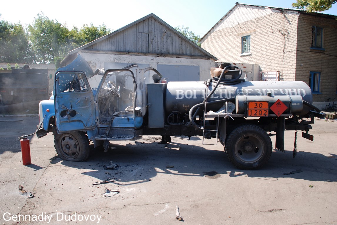 В это время приезжает ГАЗ-69 — бензовоз с цистерной. И в этот момент начинается обстрел. Прилетело несколько мин, а потом лупанули из «Града» — легло чуть дальше, у входа в штаб. Вскакиваю. Двор, который был только что забит под завязку, пуст — все скрылись в зданиях. А в глубине двора, у гаражей, набитых снарядами для гаубиц и прочего по самое не хочу, горит кабина две минуты назад приехавшего бензовоза.