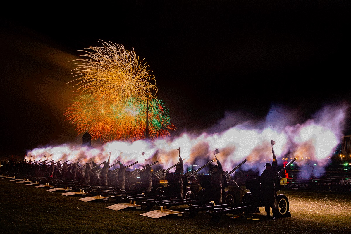 Вместо слов вечером ответ дала артиллерия Вооружённых сил России, прогремели залпы батареи отдельного гвардейского салютного дивизиона Западного военного округа имени маршала артиллерии Владимира Михалкина. 24 залпа пушек ЗиС-3 времён Великой Отечественной войны сопровождали салют на Поклонной горе.