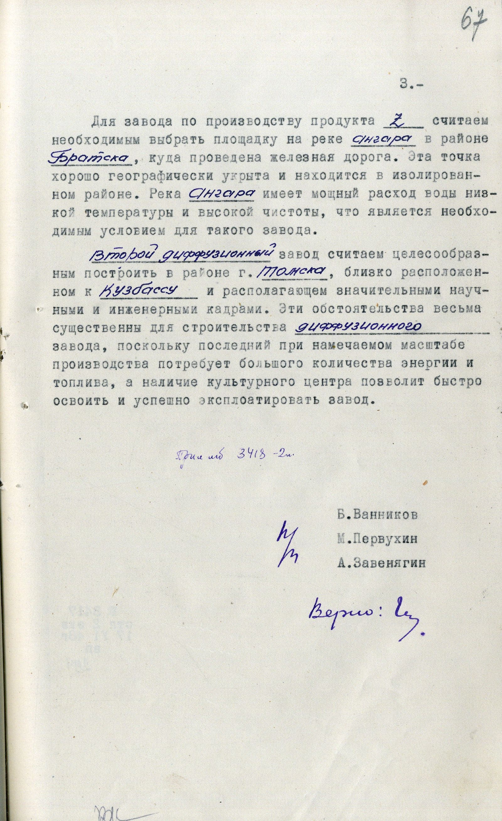 Подходящей для строительства завода по производству плутония Ванников называл площадку на реке Ангаре в районе Братска, а завод по обогащению урана предлагал построить в районе Томска, расположенного рядом с Кузбассом. Предложения Ванникова были реализованы, первому предприятию присвоили № 815, а второму — № 816.